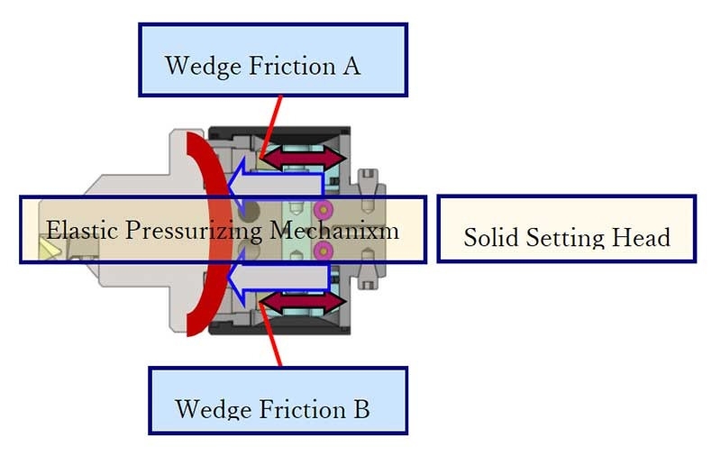 - The original pressure boosting mechanism converts the power to about 100 times, and the tilting wedges facing each other forcibly correct it.
